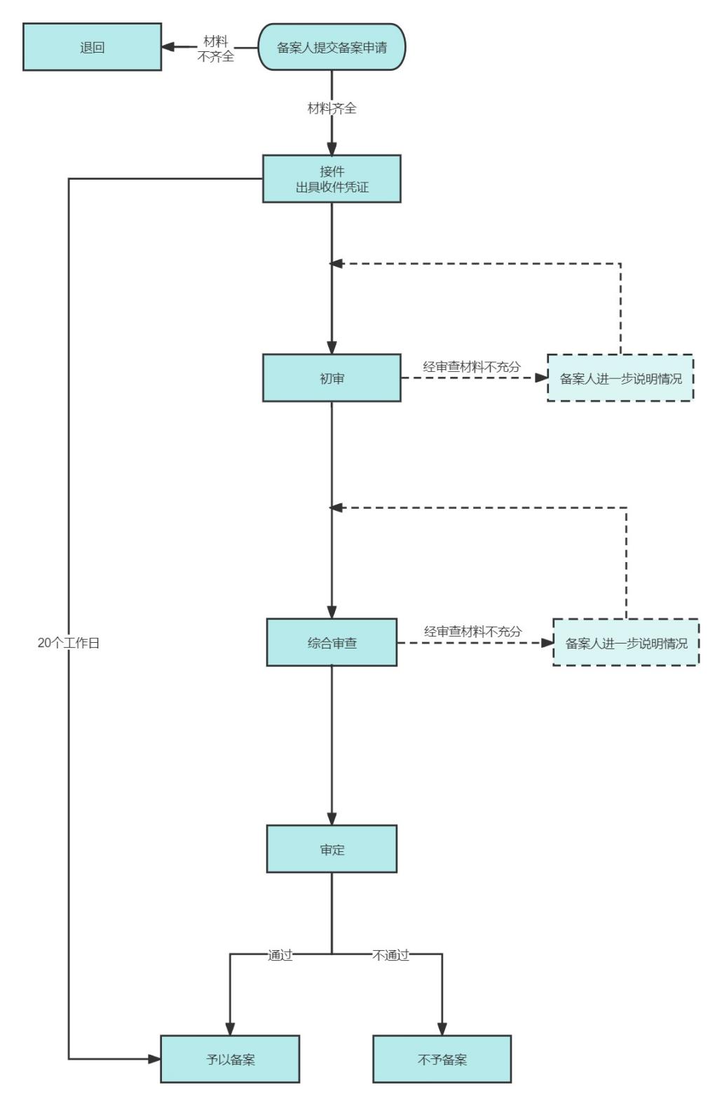 备案人通过邮寄或现场提交备案材料,经办人员检查判断是否符合指南有关要求。不符合备案标准,需补充修改的,一次性告知备案人补正全部材料。