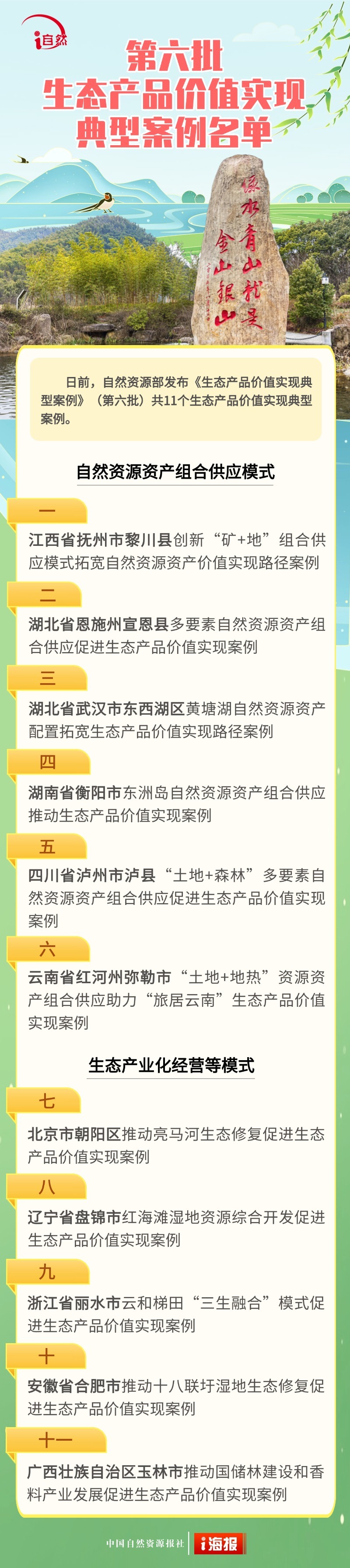 日前,自然资源部发布第六批11个生态产品价值实现典型案例,旨在贯彻落实党的二十届四中全会精神,发挥典型案例的示范作用,推进生态产品价值实现的实践探索。